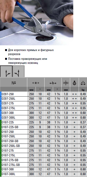 ER-D207-250L D207-250L Ножницы по металлу, для прорезания отверстий, левые, рез: 1.0 мм, 250 мм, короткий прямой и фигурный рез 7291р.