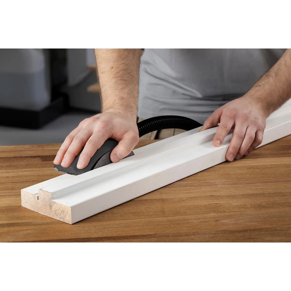 Ручной блок имеет закругленные углы и идеально подходит для шлифования труднодоступных зон и уголков. Он имеет плоскую конструкцию и форму удобную для пальцев. Для этого шлифовального блока используются шлифкруги 150мм с 15 отверстиями, если необходим отвод пыли. Для комфортной и чистой работы используется пылеудаляющие устройства которые соединены с шлифовальным блоком коническим адаптером и шлангом Ø 20 мм х 4 м