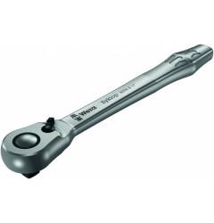 | Исполнение: | кованая цельнометаллическая трещотка (хромомолибденовая), особо прочная, с большим сроком службы; вытянутая форма для работы также в очень ограниченном пространстве; тонкая механика из 72 зубцов с углом возврата всего 5°; переключатель реверса для удобной работы, надежная фиксация насадок |
