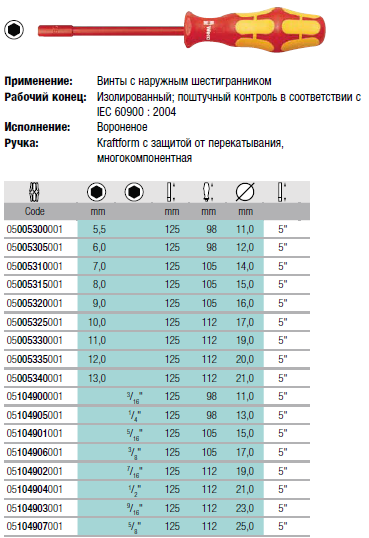 WE-005340 190 i VDE Отвёртка диэлектрическая торцевая, 13 x 125 мм, с внутренним шестигранником 2969р.