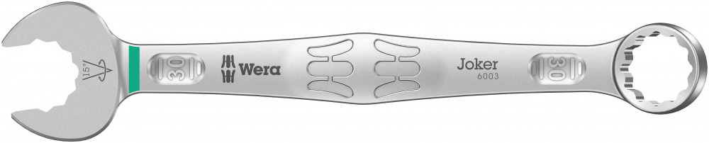 Поскольку завинчивать приходится всё чаще в ограниченном пространстве, то требуются инструменты, которые помогут успешно работать даже в таких условиях. В ограниченном пространстве необходимо изыскивать возможности для манипуляций инструментом. Можно ли изменить гаечный ключ так, чтобы повысить эти возможности для инструмента? Сочетание в рожковой части наклона под углом 7,5° и профиля в виде двойного шестигранника увеличило вдвое возможности для накидывания ключа. При повторных поворотах ключа в процессе завинчивания на 180° относительно продольной оси предусмотрены четыре варианта накидывания ключа, когда гайка или головка винта захватывается через каждые 15°. Joker 6003 благодаря продуманной форме рожковой части значительно расширяет варианты применения в ограниченном пространстве. Можно сказать, Joker 6003 сам находит соответствующее положение после каждого перекидывания. Тонкая и при этом прочная накидная часть изогнута на 15° к оси инструмента. За счёт качественного покрытия обеспечивается надёжная, длительная защита от коррозии. С идентификатором инструментов Take it easy: цветовая кодировка размера.