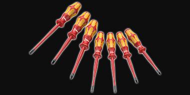 Kraftform: безопасная отвертка; с уменьшенным диаметром рабочих концов и частично с меньшим диаметром ручек. Винты с шлицем и с Комбинированный профиль Phillips/шлиц, Комбинированный профиль Pozidriv*)/шлиц. 7 предметов